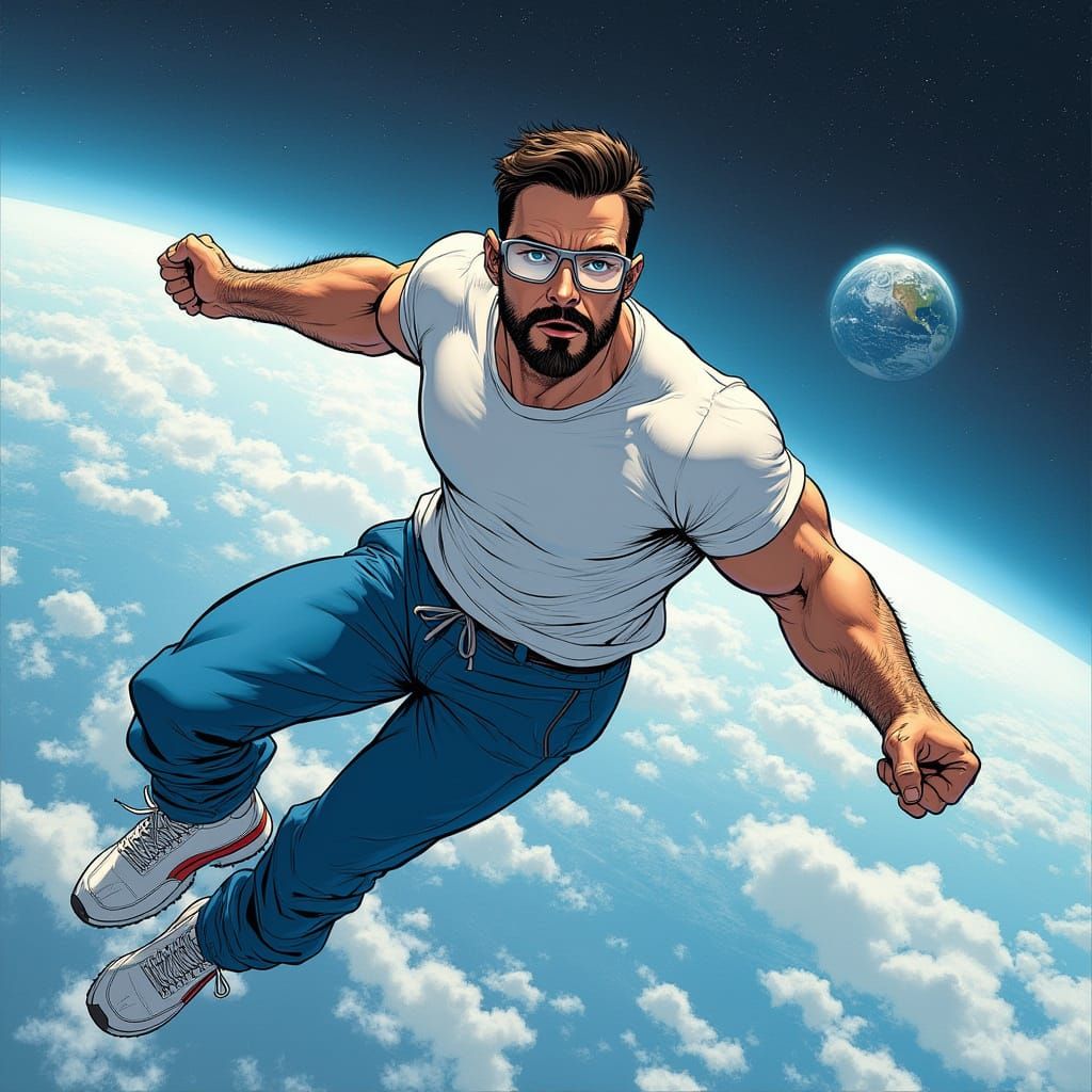 A powerful man with a rugged beard and piercing blue eyes flies through the cosmos, gazing down at the vibrant blue planet below. This dynamic comic book art piece blends the styles of Jim Lee, Mark Brooks, and Dan Mumford, with bold lines, vivid colors, and a sense of action and energy.