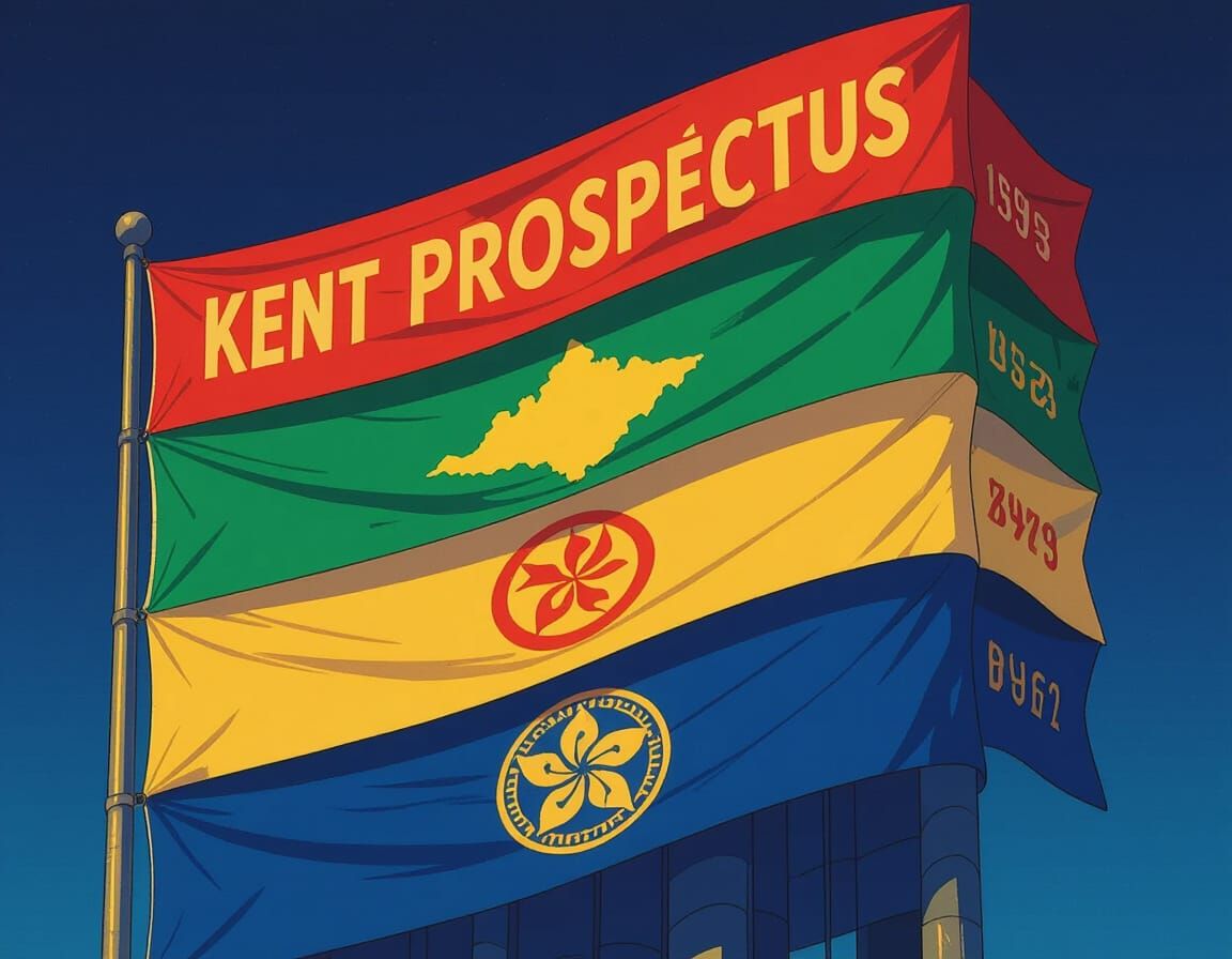 This image showcases a stack of intricately detailed flags, including one with 'KENT PROSPECTUS' and another with a Hong Kong outline. Rendered in a digital matte painting style with dramatic lighting.
