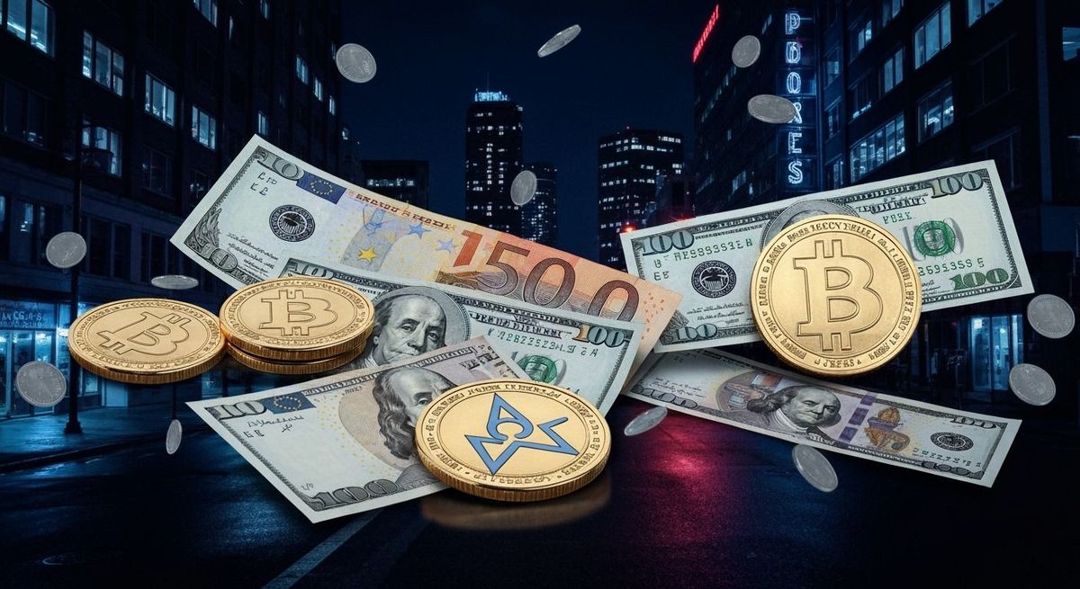 This image showcases Euro, Dollar cash, and Monero coins against a vibrant night cityscape. Neon lights reflect on currency, creating a dynamic, high-contrast scene with a deep color palette.