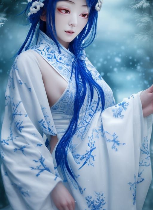 This image shows a beautiful Yuki-onna with porcelain skin wearing an intricate blue and white kimono. The image features hyperdetailed, complex, and realistic elements with glowing lighting.