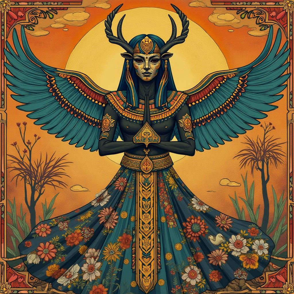 A vivid image of an Egyptian god in patterned linens, surrounded by vibrant folkloric illuminations. This digital artwork blends ancient symbolism with a modern, mystical aesthetic.