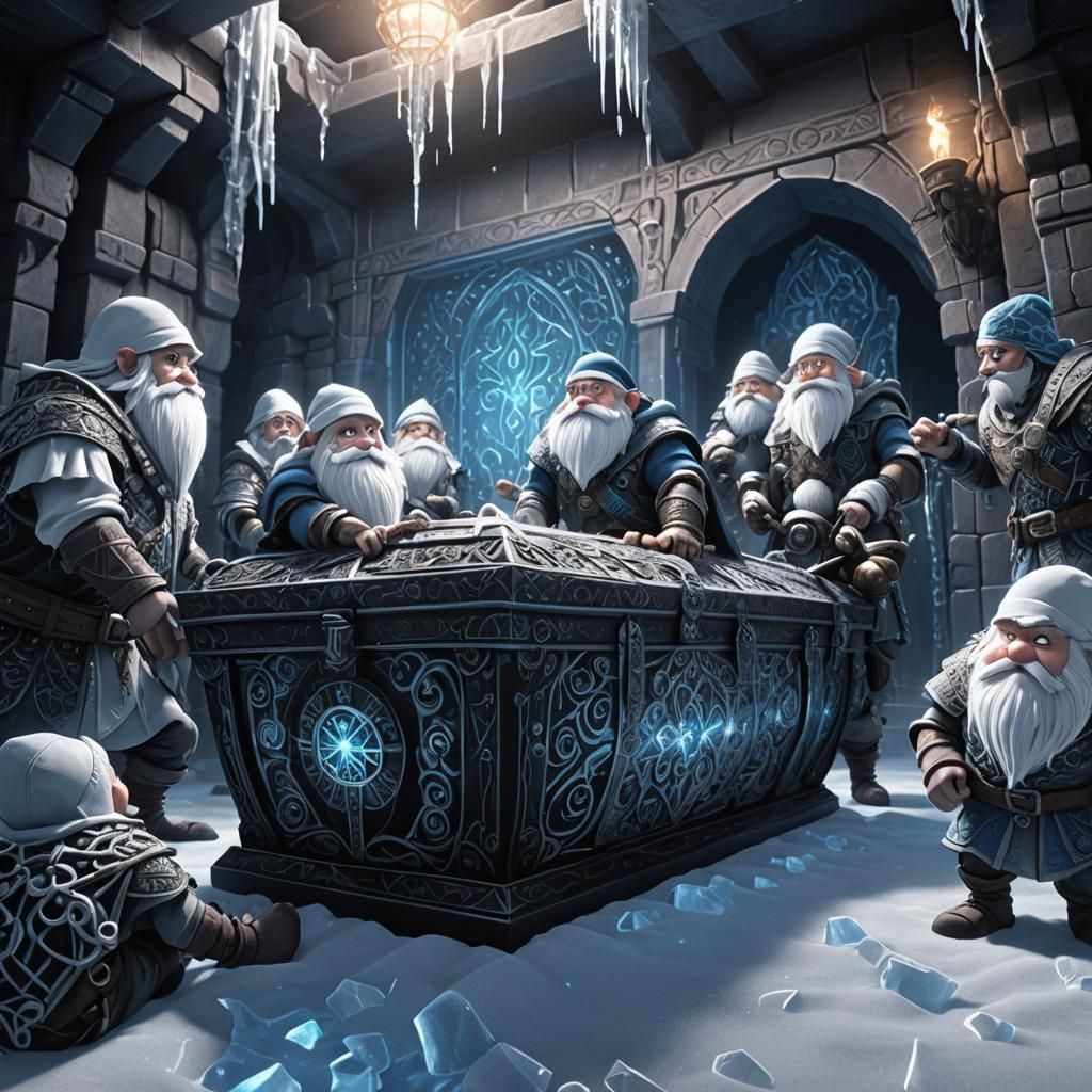 This image shows seven dwarf warriors gathered around a coffin in a dark dungeon. The coffin is made of mithril, covered in glowing chains and frost, and rendered as detailed 3D digital art.