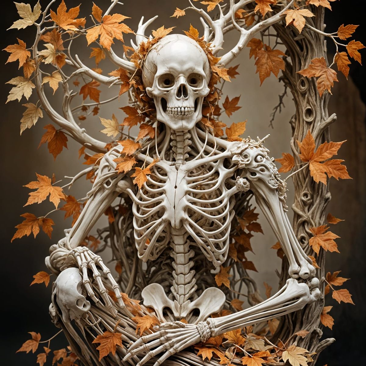 This image depicts a stunning, intricately detailed skeleton sculpture in ivory and orange hues, surrounded by swirling fabrics and autumnal leaves, evoking a sense of fantasy and mystique.