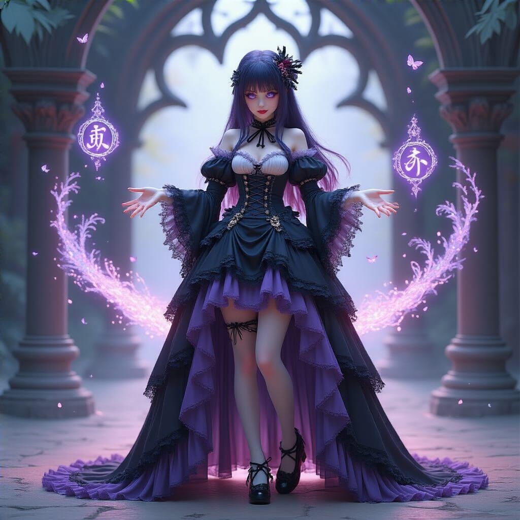 This image shows Kitagawa Marin in a beautiful, ethereal gothic fantasy cosplay. Magical runes and glowing symbols swirl around her in an enchanted urban nightscape, rendered as glowing 3D art.