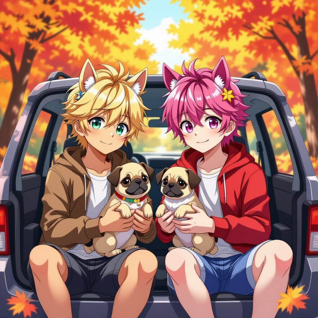 This image shows two young anime men with horse ears, one blond and one pink-haired, holding a pug puppy while sitting in a car amidst colorful autumn leaves. The art style is anime with rich colors and dynamic lighting.