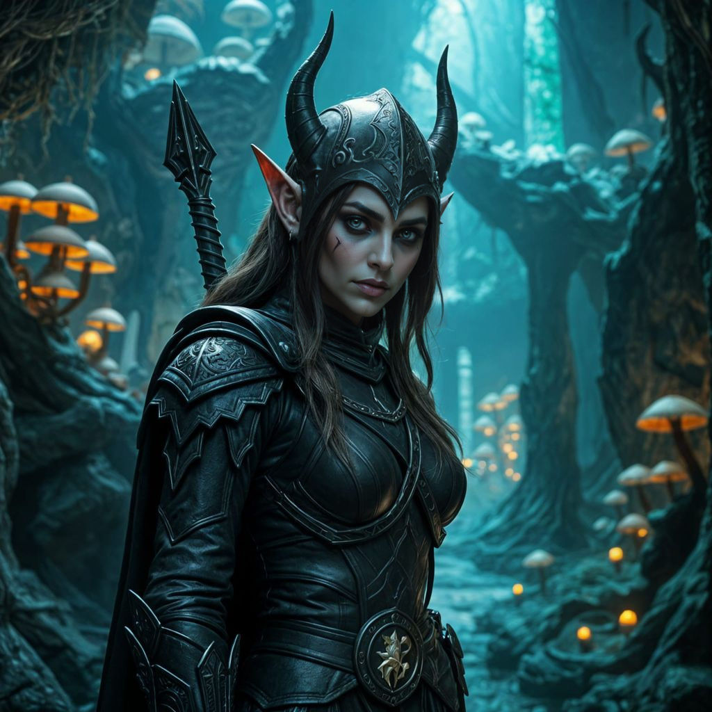 This image is a stunning cinematic still of a dark elf ranger, set against a scenic underground backdrop, with a focus on high detail and atmospheric lighting.