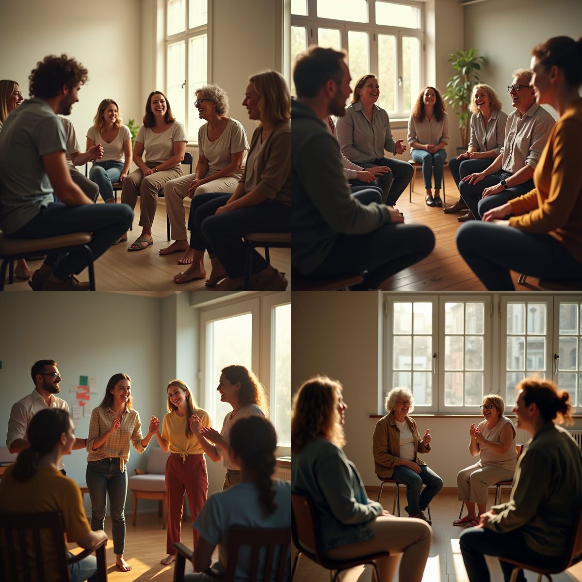 This image shows office workers participating in a laughter therapy session. The photo captures a group of men and women in a circle, laughing and interacting in a sunlit room, rendered with film grain and a blurred background.