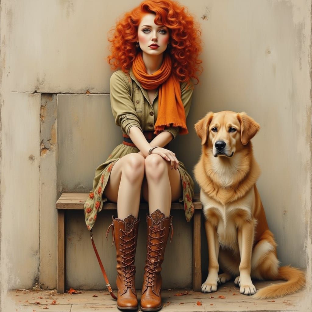 This image shows a red-haired woman with voluminous curly hair, dressed in vintage clothing and an orange scarf, seated beside a large, fluffy dog. The oil painting features expressive brushstrokes and high detail, evoking an elegant, whimsical mood.