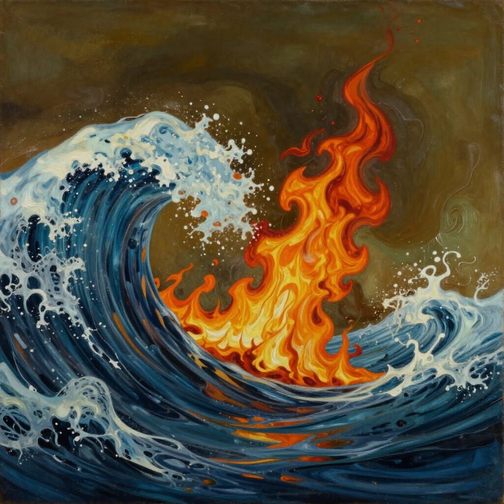 This image depicts a surreal battle between waves of fire and water, rendered in the style of a melting oil on canvas painting with a matte background.