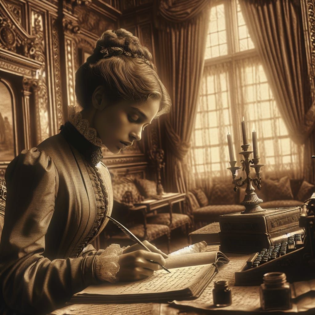 This image shows a Victorian poet writing in her notebook. The room is filled with Victorian era details in sepia tones. The image is reminiscent of a digital matte painting.
