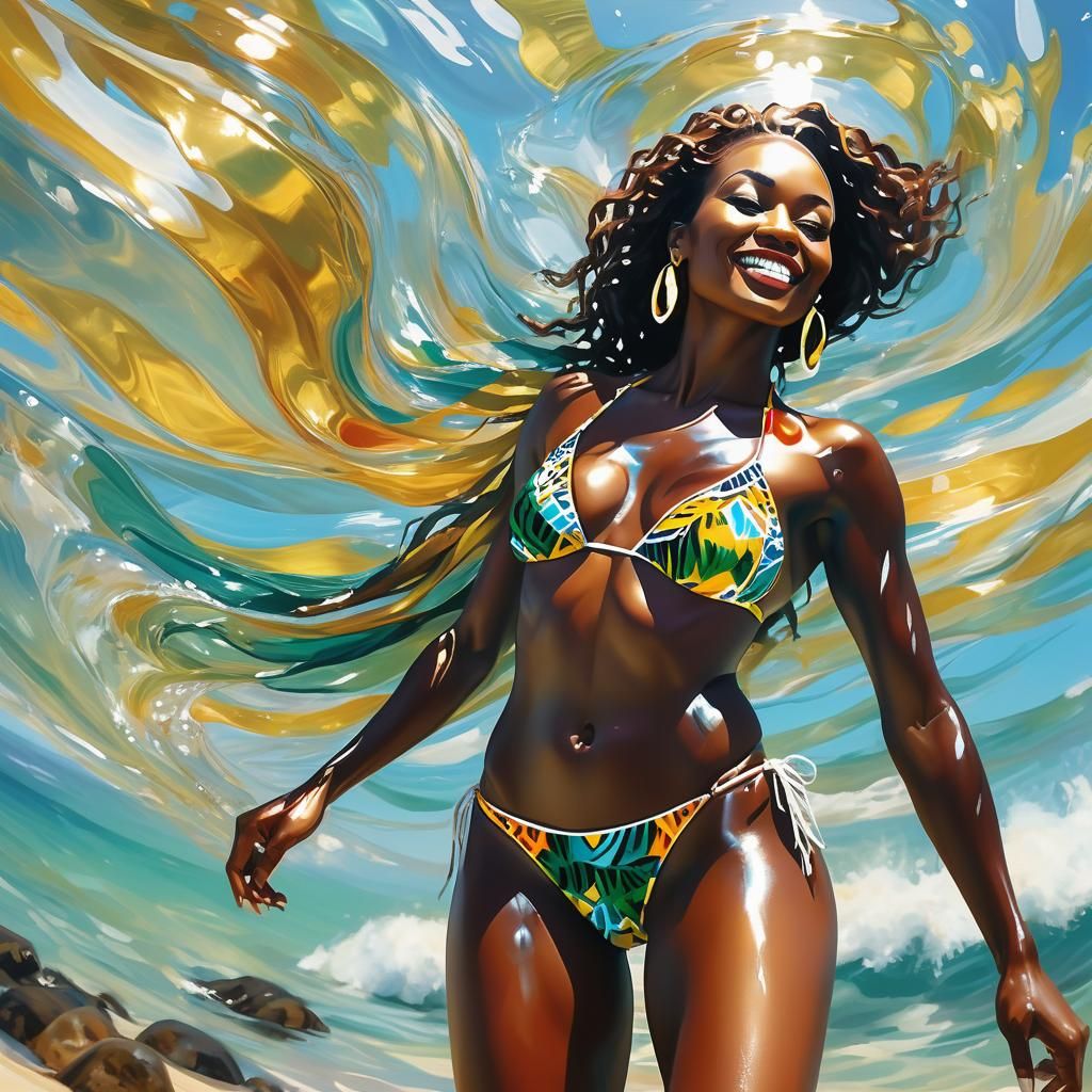 A vibrant image of a radiant Taíno woman emerging from the Caribbean Sea, kneeling and smiling. The scene is bathed in golden sunset light, with her body painted in bright African colors in an impressionistic style.
