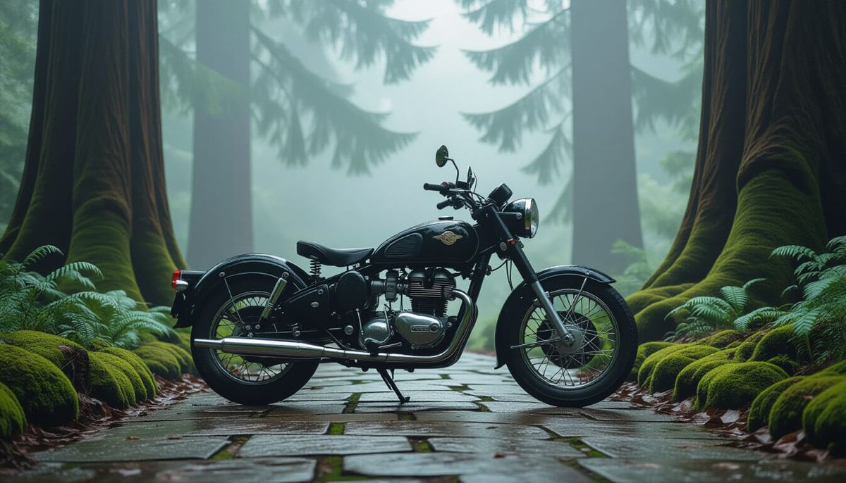 This image depicts a solitary vintage motorcycle on a mossy path surrounded by fog-shrouded ancient trees. It evokes profound peace and isolation with soft, diffused lighting and a desaturated color palette, reminiscent of moody cinematic photography.