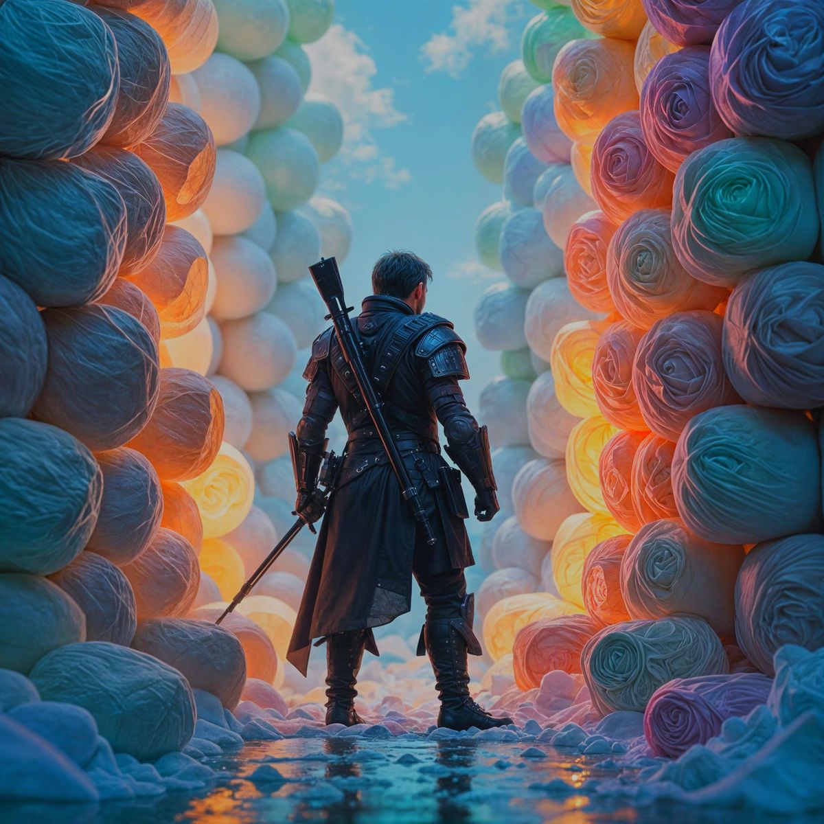 This photorealistic image shows warrior Atticus in a close-up portrait surrounded by giant, glowing marshmallows taller than him. The scene features dynamic and volumetric lighting with vibrant colors and intricate details.