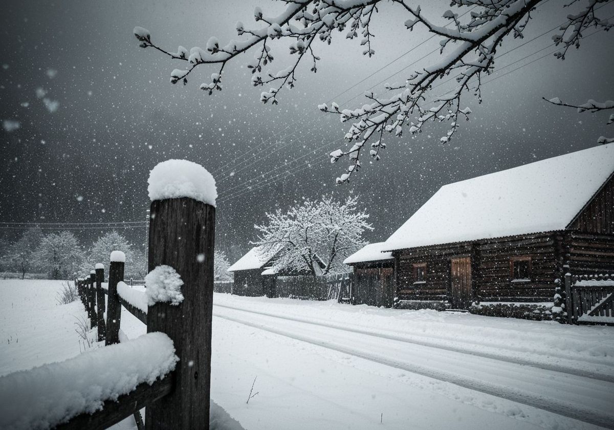 This image depicts a bleak winter scene with a snow-covered road, fence post, and rustic building under a dark, high-contrast sky. Snowflakes fall heavily, creating a monochromatic atmosphere.