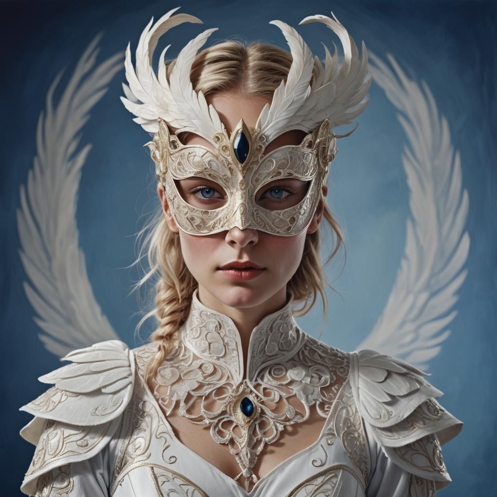 A hyperrealistic portrait of a young woman wearing a swan mask. The image features a softly lit fantasy concept in vibrant colors, with metallic accents and glowing threads, rendered with Unreal Engine 5 quality.