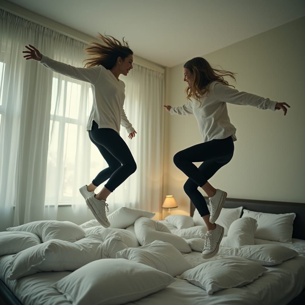 This image depicts two teenage girls jumping on a bed covered in pillows. The scene is captured with cinematic techniques, including film grain, vignette, dramatic lighting, and atmospheric depth.