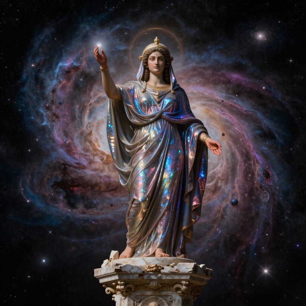 An ancient Armenian deity, cloaked in celestial fabric, stands on a crumbling marble pedestal overlooking a cosmic nebula. Wisps of stardust trail from her form, coalescing into nascent galaxies. The atmosphere is thick with primordial energy, rendered in a style that merges Renaissance chiaroscuro with ...