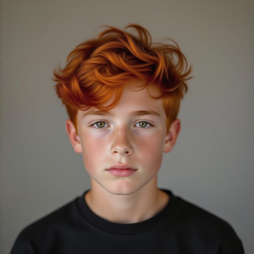 A dreamlike, surreal portrait of a young boy with vibrant orange hair and dark eyes, rendered in a distorted, shadowy style with unexpected floating elements.