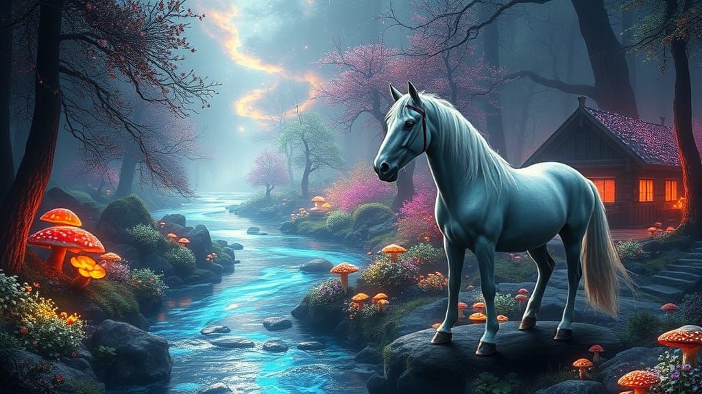 A digital painting shows a cosmic river flowing through a bioluminescent forest. A blacksmith's workshop sits nearby, with two Friesian horses with pearlescent coats. Rendered with cinematic lighting in an oil painting style.