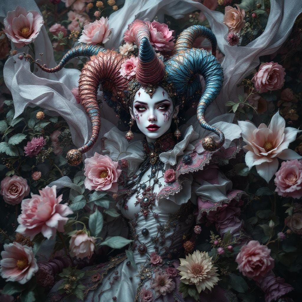 This image shows a modern-day female court jester in elaborate attire. The portrait features abstract floral patterns, whimsical surrealism, dark fantasy elements, and dramatic lighting in a painterly style.