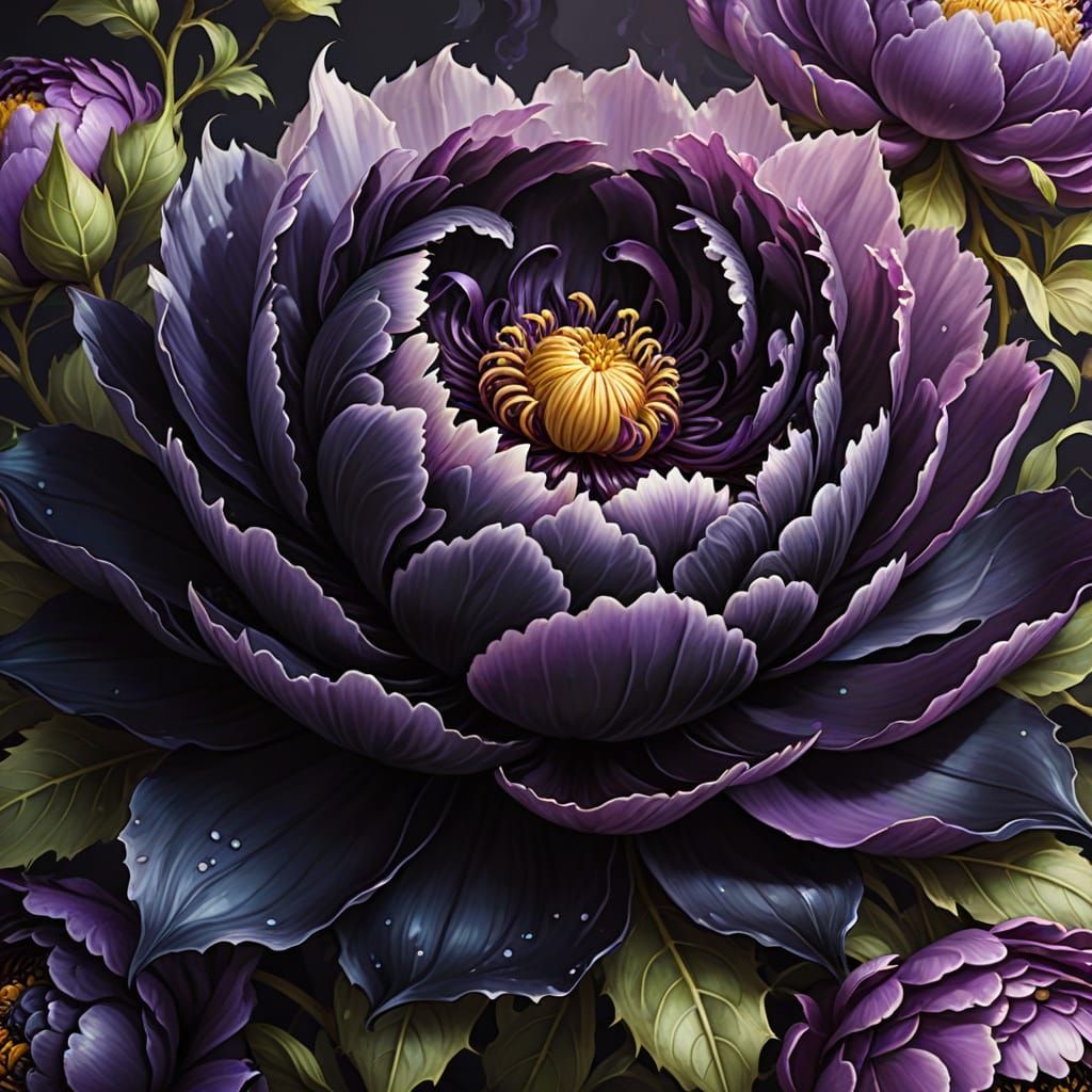 This image shows a close-up fantasy illustration of a black peony flower intertwined with a purple dragon. The vibrant oil painting features delicate petals and glistening scales under soft lighting, rendered in 4k resolution.