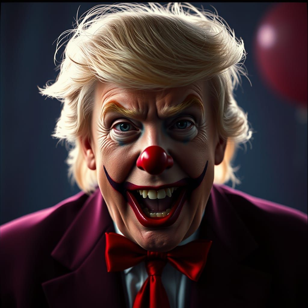 This image shows a clown with features resembling Donald Trump, presented as a high-quality cinematic still. The image is atmospheric and dramatic, with film grain and vignette effects.