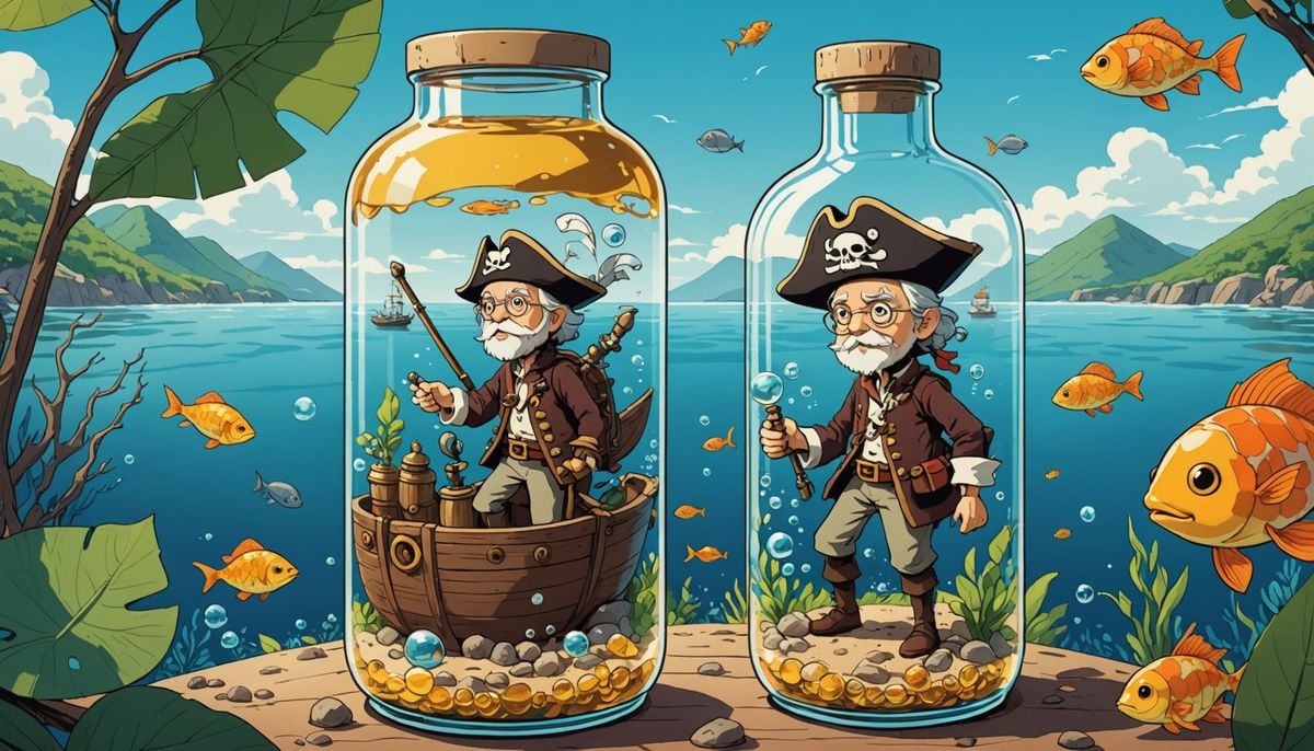 This image showcases a fantastical scene of a pirate ship sailing on a golden ocean within a glass bottle, inspired by hand-drawn animation with soft lines and natural lighting.