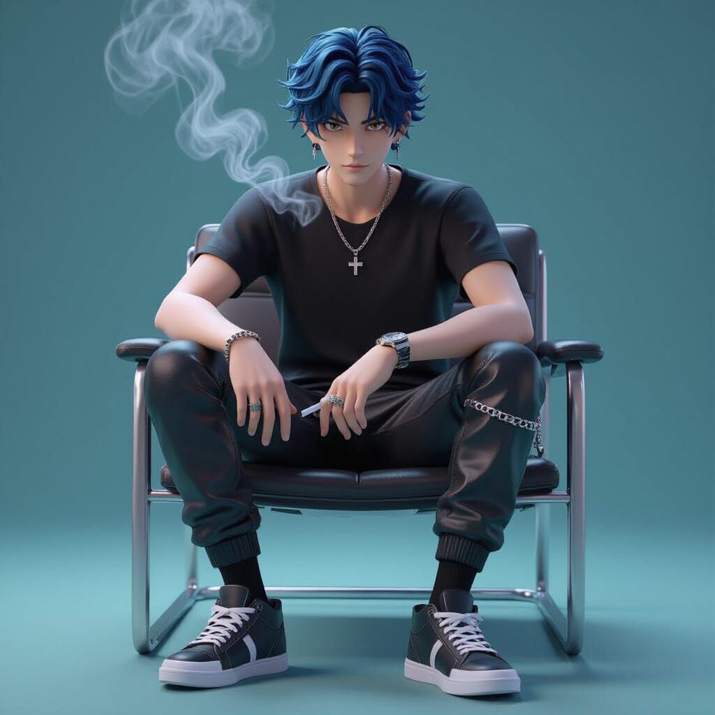 This image depicts a young man in a semi-realistic 3D anime style, seated on a modern armchair. He leans forward, holding a cigarette, with smoke around him. The scene features cinematic lighting and a dark gradient background.