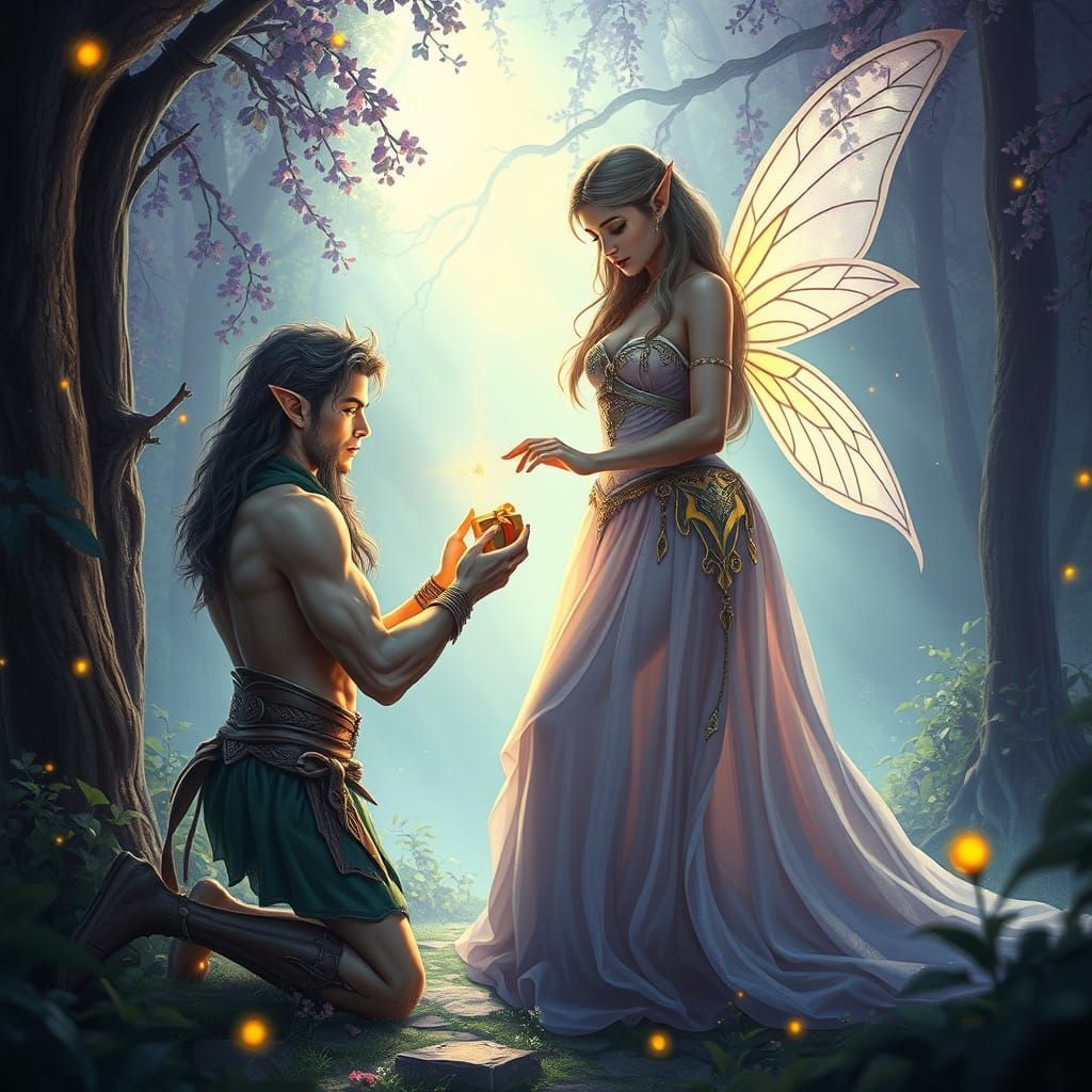 A captivating image of an elf warrior presenting a starlight gift to a fairy queen in a hidden grove. Soft, ethereal lighting and fireflies enhance the scene, with vibrant colors.
