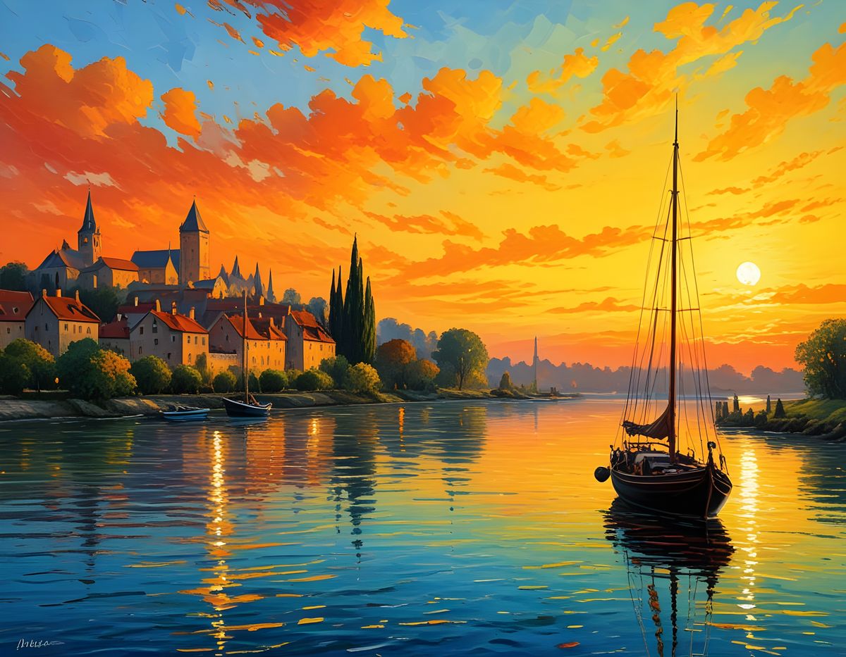 This image shows a vibrant impasto oil painting of a tranquil waterscape at sunset. A sailboat and distant castle are visible, with a glowing reflection on the water, rendered with impressionistic brushstrokes.