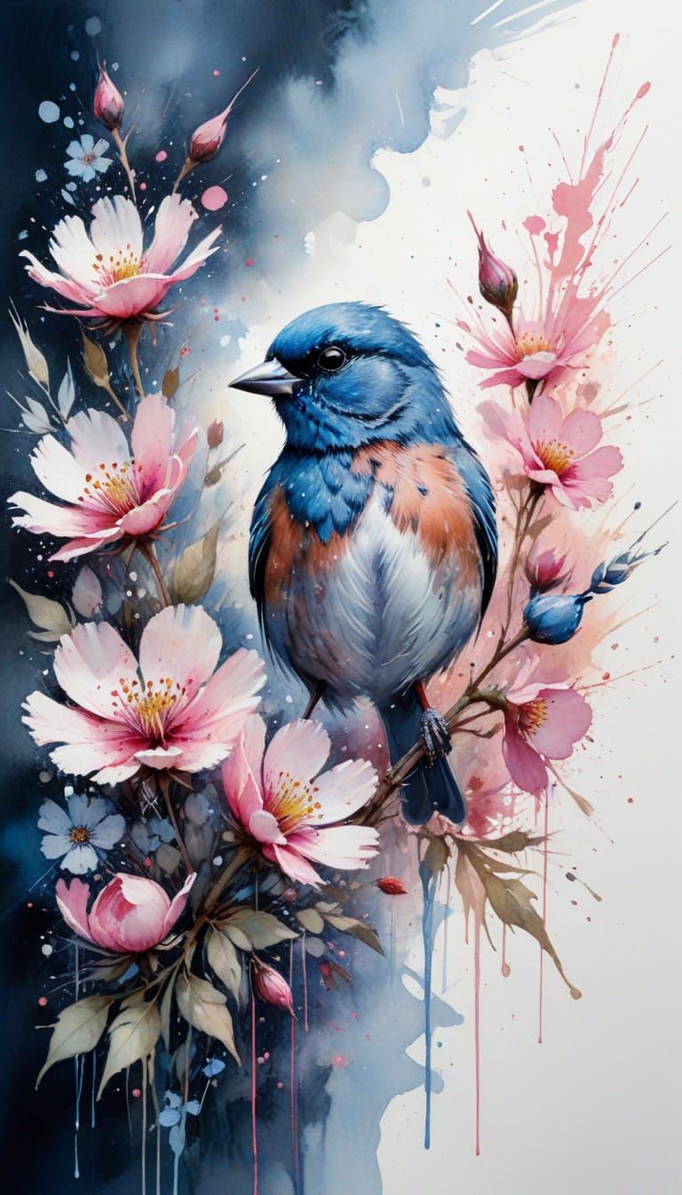 A nocturnal watercolor painting of a small blue finch amidst pink flowers. The artwork uses monochrome washes, layered glazing, and gouache to create a dramatic scene with a cinematic feel.