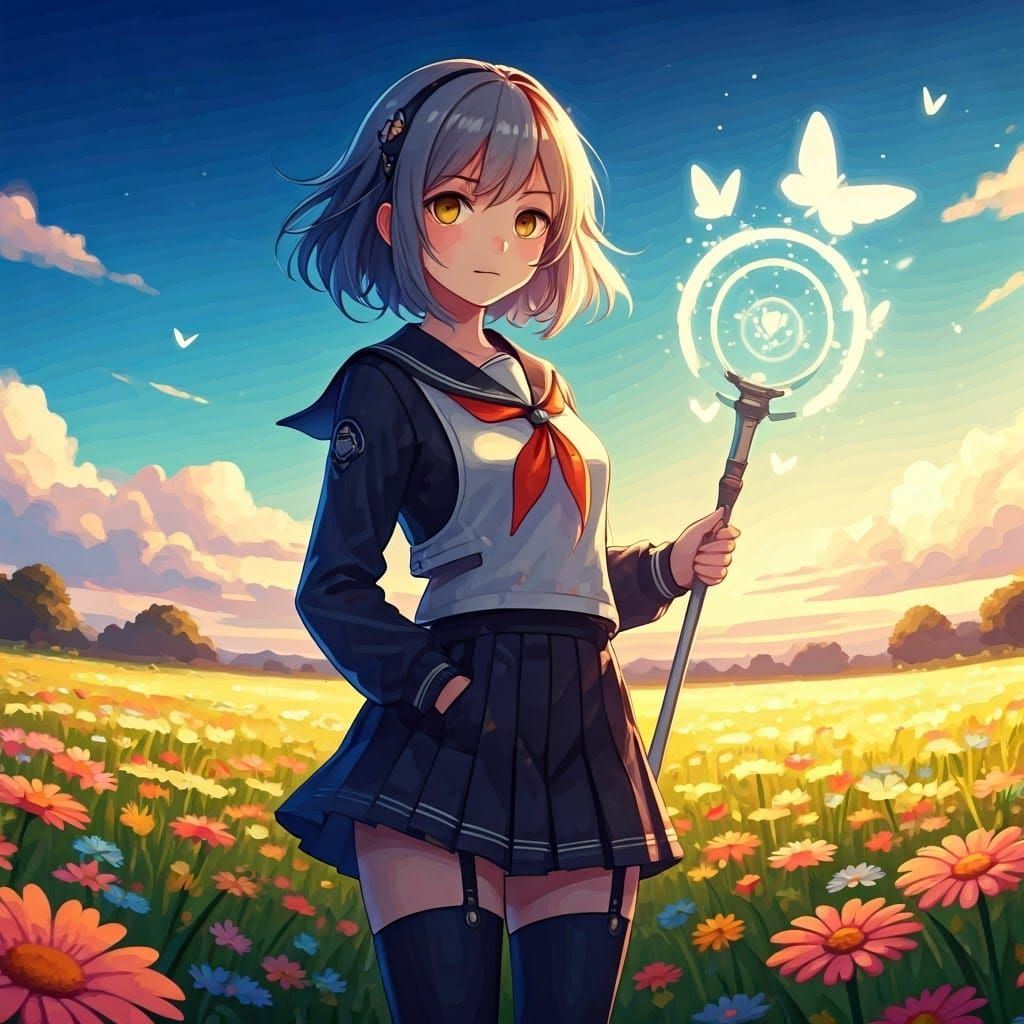 A captivating image of a confident teen in a futuristic uniform standing in a sunny meadow. Rendered in a dynamic manga style with bold lines and vibrant colors, the artwork has a cel-shaded anime aesthetic.