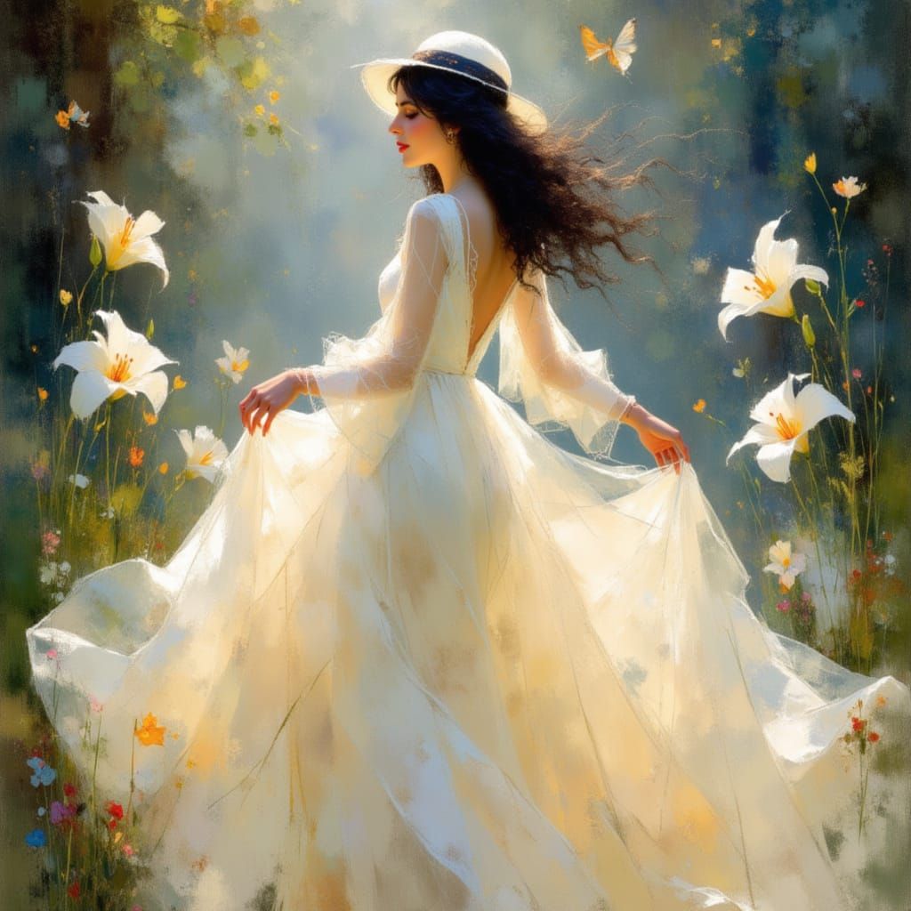 This image shows a radiant young woman adorned in a flowing gown crafted from delicate white lily petals. Iridescent light shimmers in the diaphanous mist, with butterflies in flight, in art nouveau elegance.