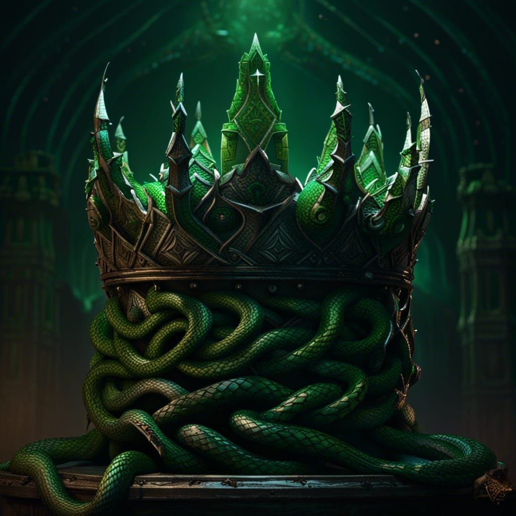 A hyperdetailed digital rendering of a snake crown. The snakes are green and black, rising to a tall peak. The image has dynamic lighting and a dark fantasy aesthetic with purple and yellow complementary colors.