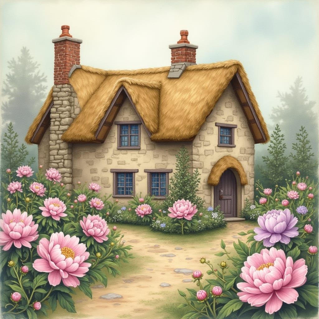 A charming image of pastel peonies around a stone cottage. The artwork evokes a whimsical, storybook aesthetic with soft colors and delicate details of flowers and foliage.