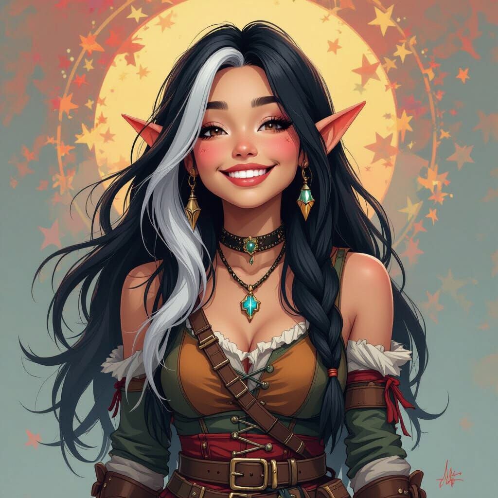 This image shows a female gnome with long black and white hair, dressed as a rogue. The character has a carefree expression and mischievous glint, set against a vibrant, slightly eerie backdrop in a whimsical art style.