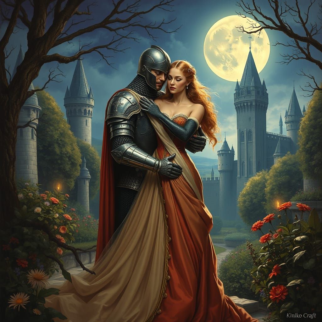 This image shows a knight embracing a queen in a moonlit garden. The artwork evokes a romantic style with dramatic lighting and intricate details, reminiscent of Pre-Raphaelite paintings.