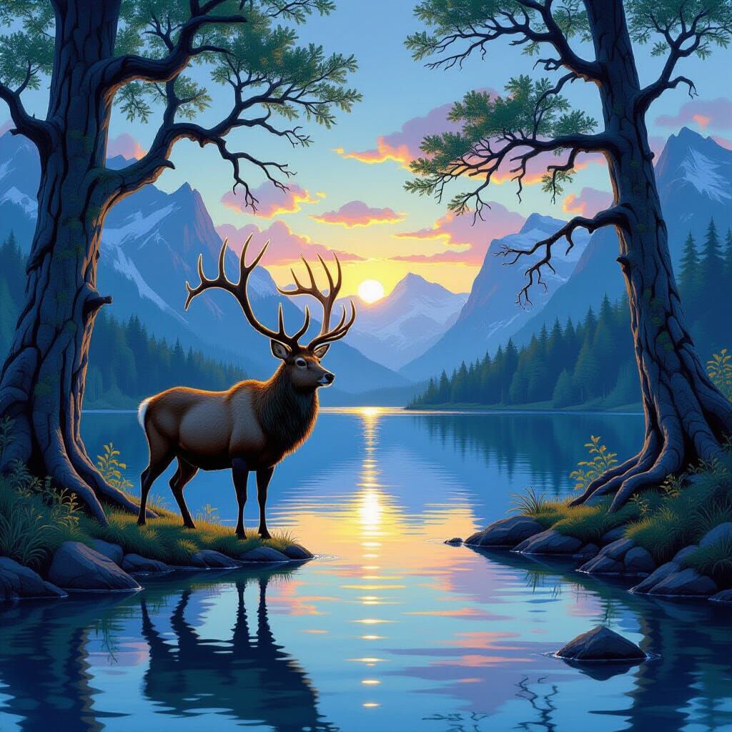 A majestic stag with glowing moss antlers stands by a crystal lake reflecting twilight, painted in vibrant hues with visible brushwork for a luminous, tranquil atmosphere.