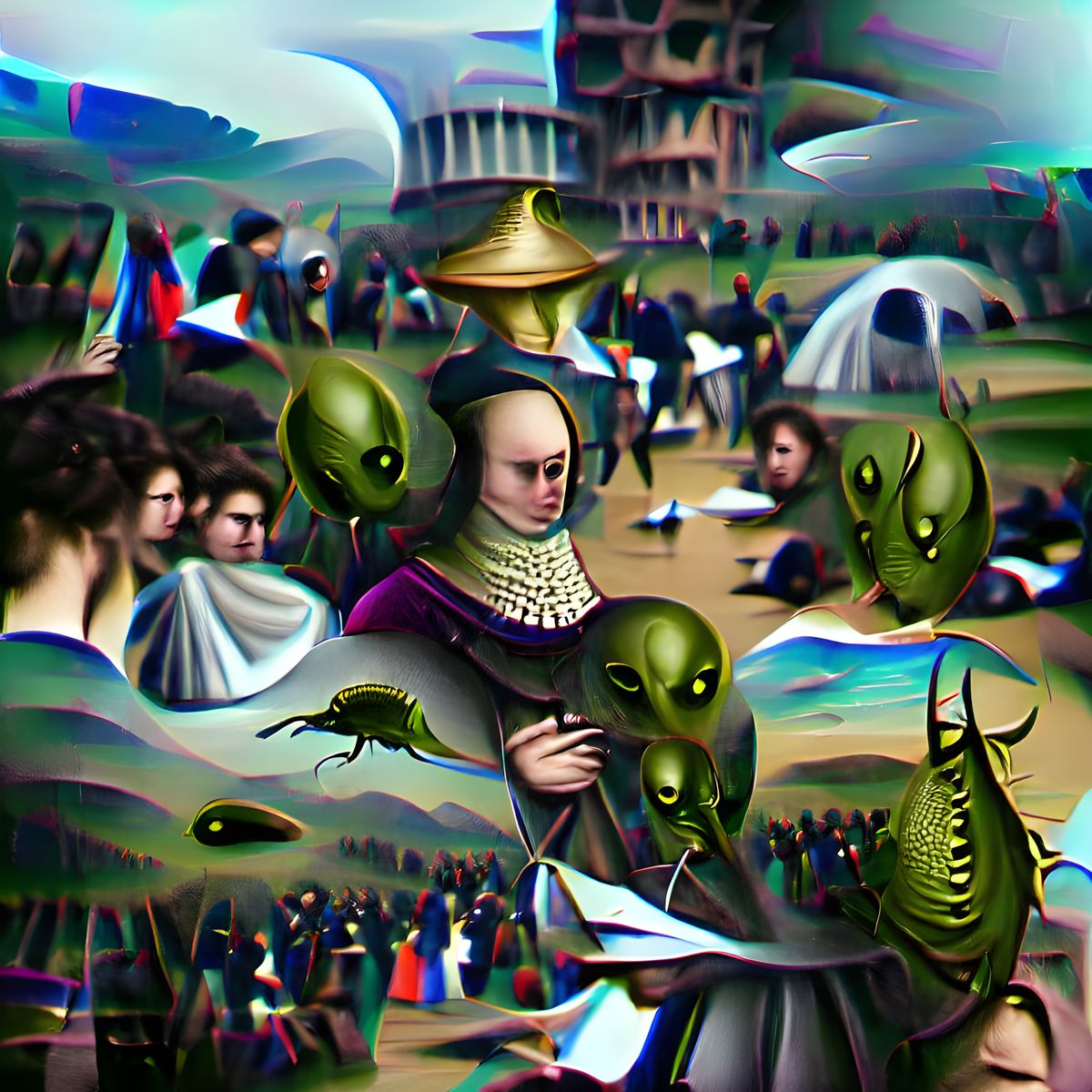A digital illustration depicting an alien invasion in the Renaissance style. The artwork combines futuristic technology with historical artistic elements.