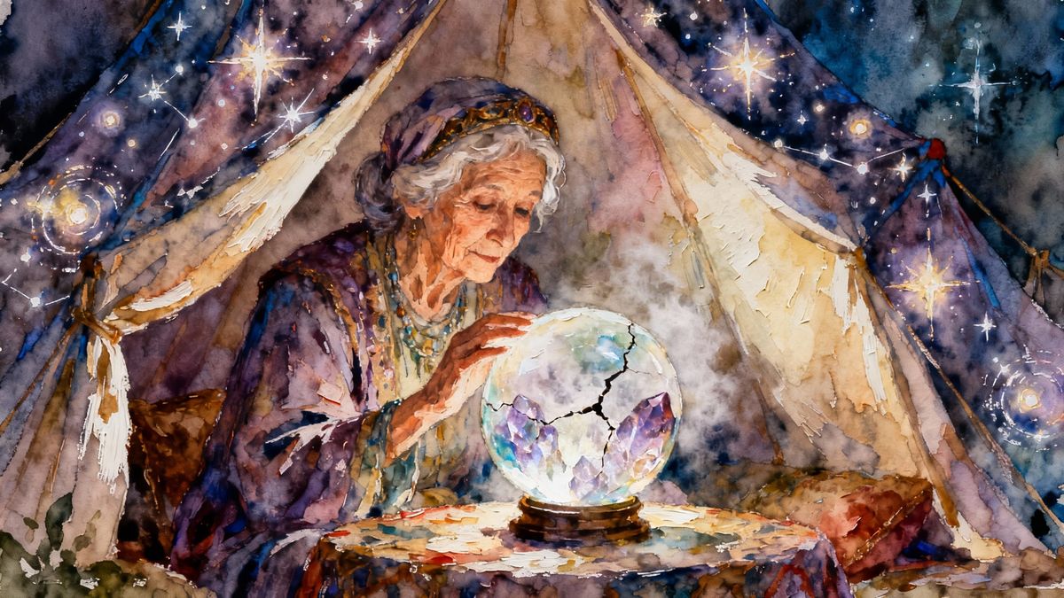 This striking painting features an elderly fortune teller inside a tent adorned with glowing astral patterns. She gazes into a cracked, misty quartz crystal ball, rendered with thick, raised watercolors.