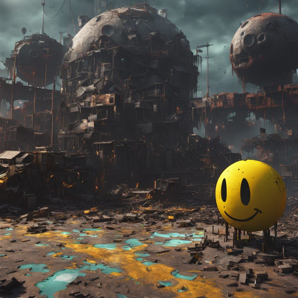 This image depicts a dystopian world on the brink of collapse, illuminated by cinematic lighting. A haunting acid smiley looms large, dripping with vibrant paint in a photorealistic concept art piece rendered in Octane.