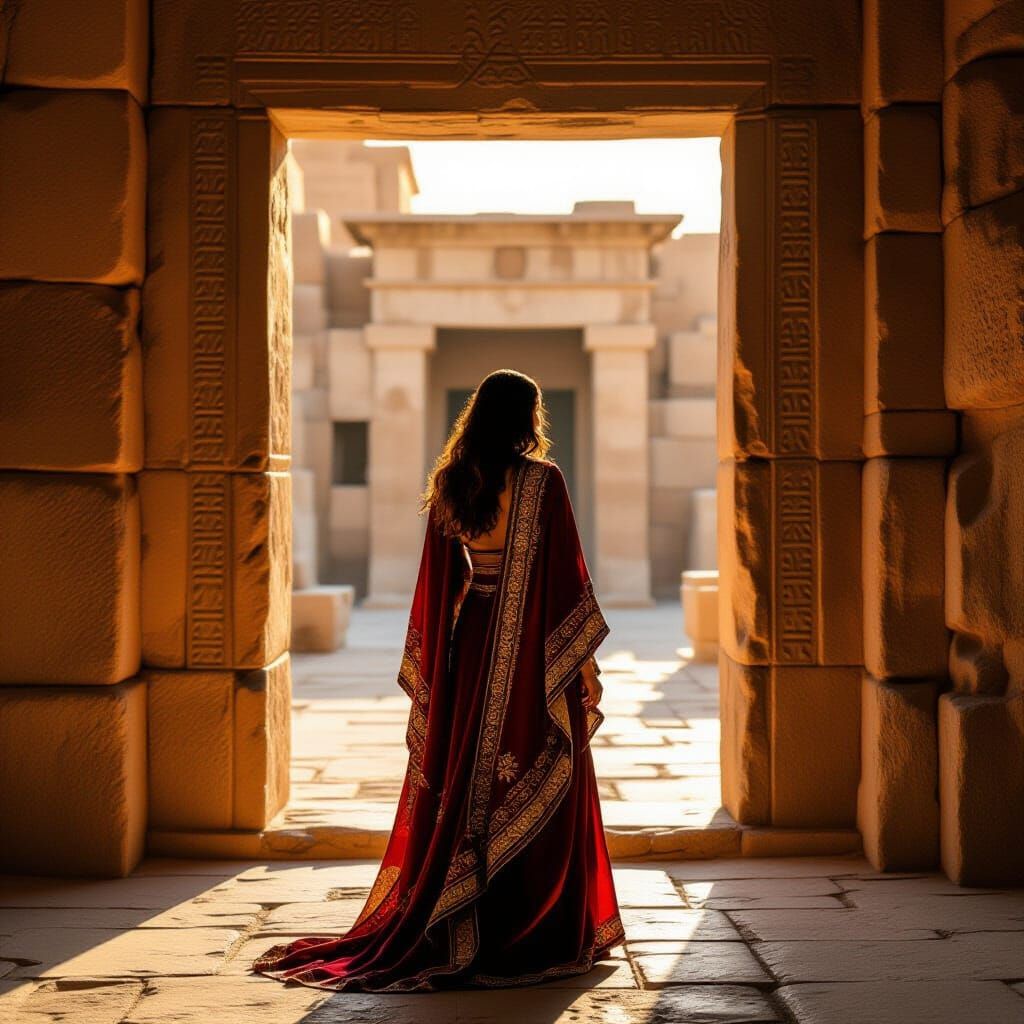 A photorealistic image of a Hebrew woman in ornate velvet robes at a weathered temple. Warm light creates dramatic shadows, highlighting intricate details of her attire and the stonework.