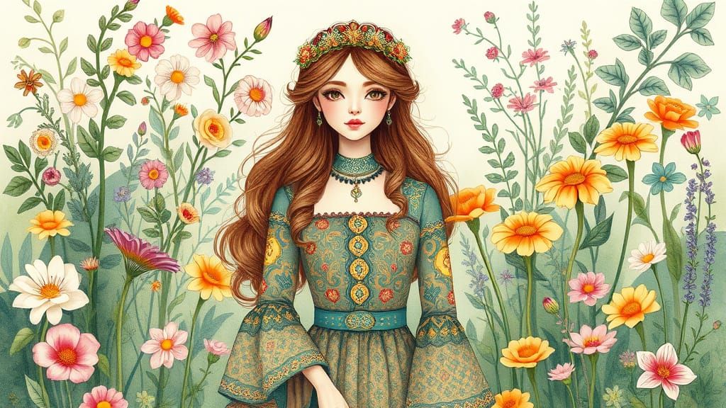This image shows a whimsical woman in a floral garden, wearing patterned clothing. The illustration has a mystical elegance and vibrant watercolor style, reminiscent of classic botanical art.