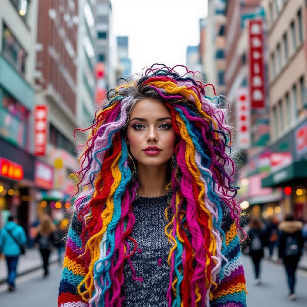 This image shows a young woman with hair made of colorful yarn standing in a busy city. The style is reminiscent of yarn bombing and street art, with surreal and whimsical elements.