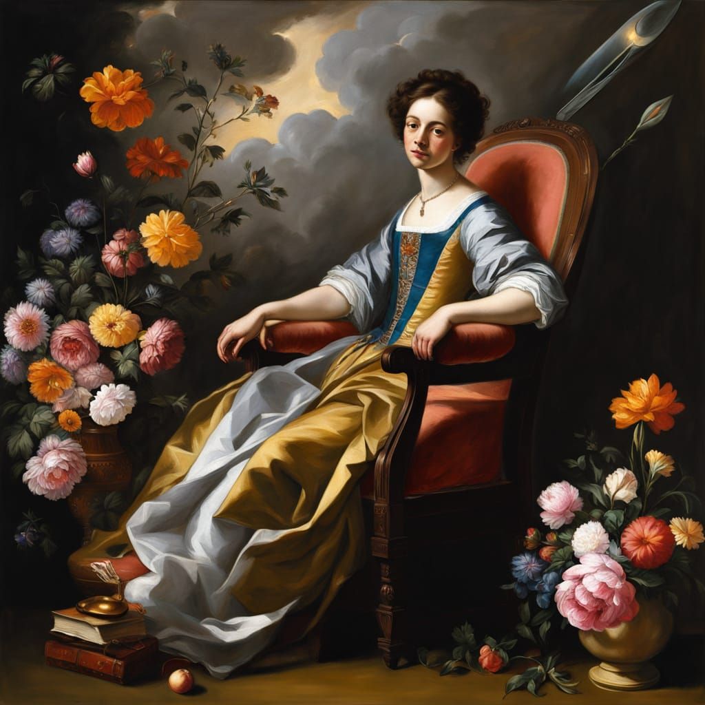 This image is a masterpiece of traditional Baroque art, featuring a woman sitting in a garden surrounded by vibrant flowers and a majestic space rocket on the launching pad, rendered in warm, soft light with delicate brushstrokes and intricate textures.