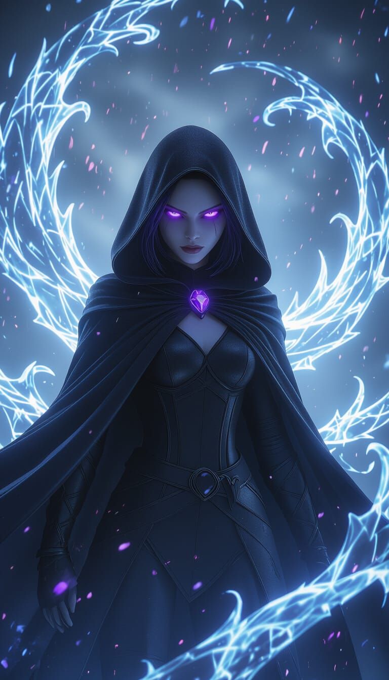 This image shows a highly detailed, cinematic portrait of Raven from Teen Titans. It features glowing eyes, a dark cloak, and a stormy aura, rendered with dramatic lighting and ultrafine detail.