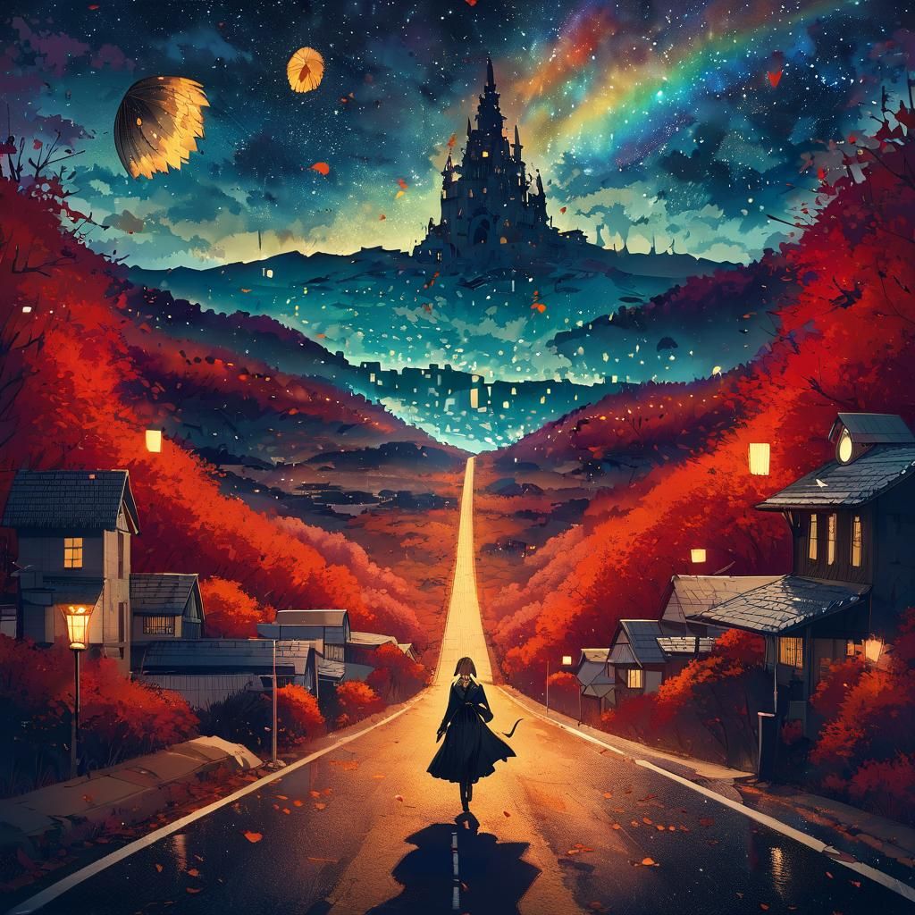This image shows an adventurer girl walking on a path at night. The scene features a beautiful night sky and autumn-themed artistry.