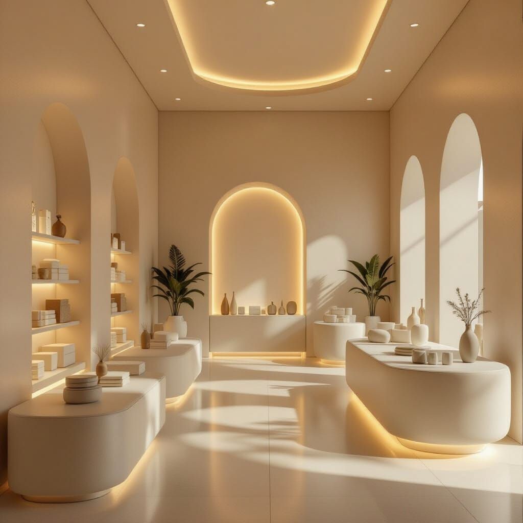 This image showcases a serene bakhoor retail store interior in warm white and beige. Soft lighting creates an inviting atmosphere with luxurious minimalist displays, blending modern sophistication with tradition.