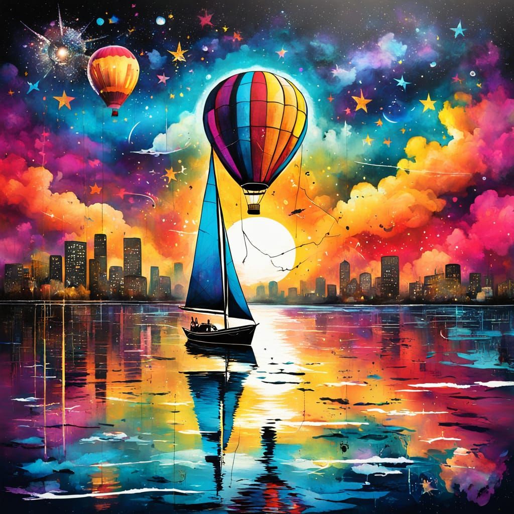 This image shows a solitary sailboat on a tranquil sea, accompanied by a radiant hot air balloon. The night sky is depicted with abstract nebulae and geometric stars in a street art style.