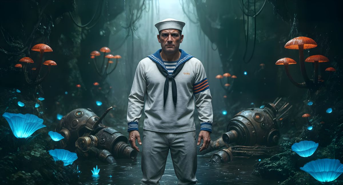 This image shows a World War I sailor in a bioluminescent cavern. The sailor is surrounded by glowing flora and steampunk fungi, with robot debris in the water. The scene is rendered in a gritty, cinematic style.